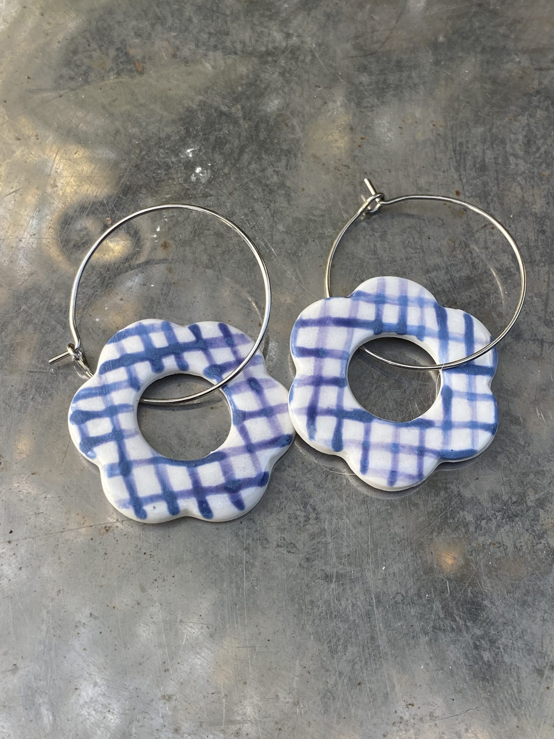 Boucles d’oreilles fleurs, décorées à l’engobe mauve de petits carreaux 🟦