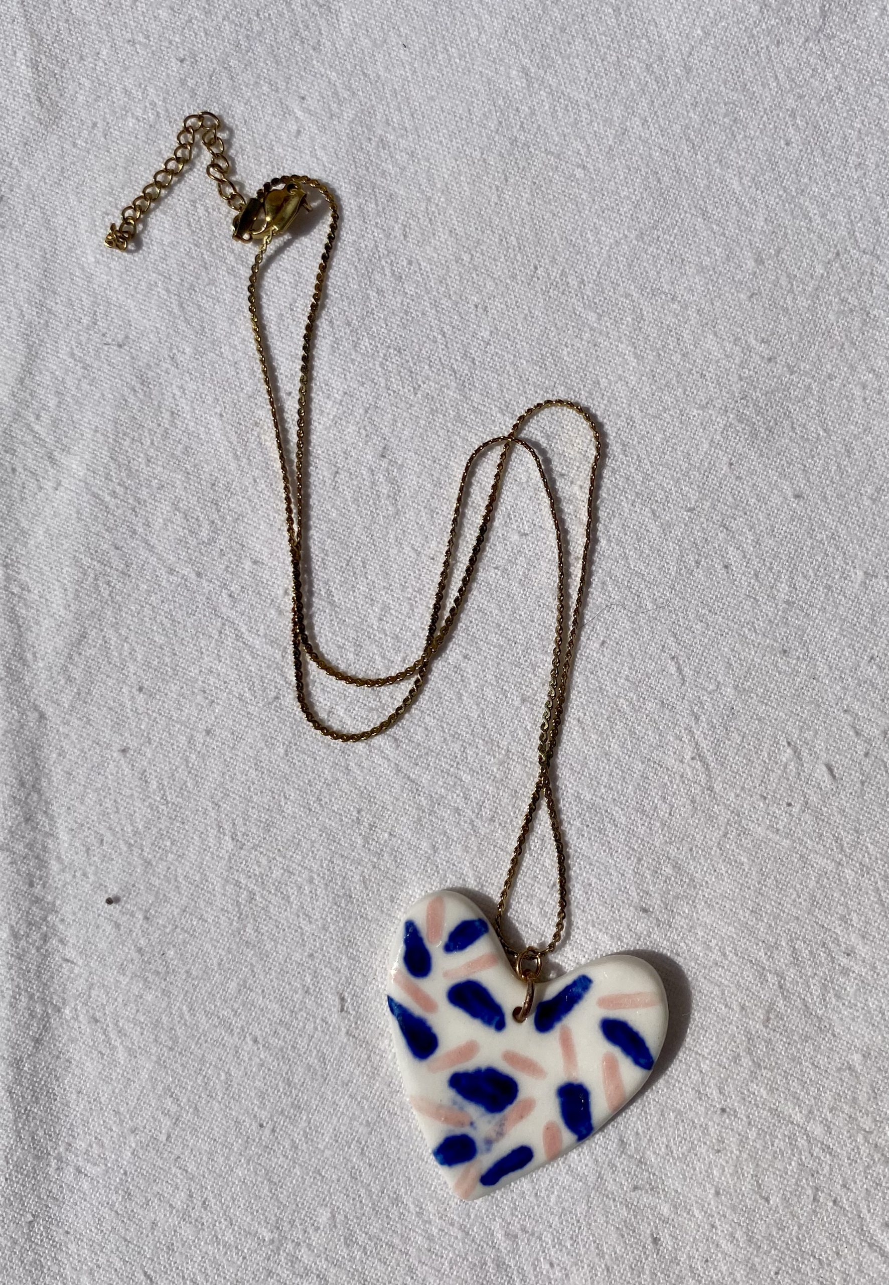 Collier en porcelaine forme cœur décoré à l’engobe rose & bleu de Sèvres.